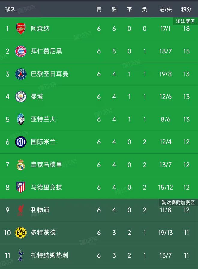 欧冠第6轮结束了所有比赛,最新积分榜如下!
